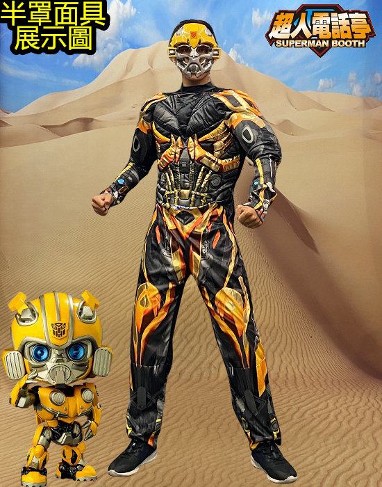 變形金剛大黃蜂變裝cosplay服裝出租(租借) 【The Transformers】 角色名稱 : 變形金剛 – 大黃蜂 商品代號 : AB3063 商品尺寸 : L 碼 商品包含 : 1 – 連身衣 2 – 半罩式面具 【額外加租配件】 1 – 全罩式頭盔 代號 BC0040 $300 2 – 武器 代號 BA0366 $300